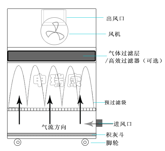 5.倒置進(jìn)風(fēng)設(shè)計(jì),袋式過(guò)濾,大顆粒粉塵會(huì)沉降至底部積灰斗,最大程度增加了容塵量。